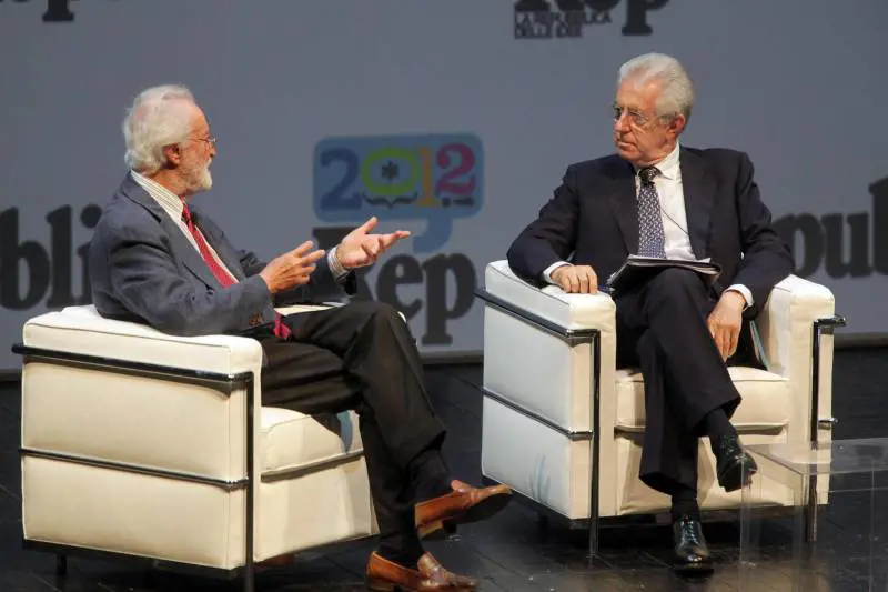Sul palco bolognese della Repubblica delle idee parla Mario Monti, invitato alla festa di Repubblica, intervistato da Ezio Mauro, direttore del quotidiano e dal fondatore Eugenio Scalfari. Fuori centri sociali e collettivi protestano contro la crisi economica, prendendo a pretesto la visita del premier in città.