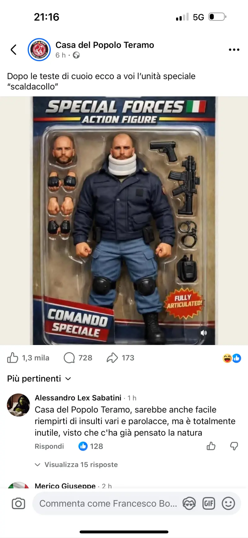 La "Casa del Popolo" di Teramo, via social, posta una action figure di un poliziotto con uno "scaldacollo". Il personaggio ritratto nell'immagine, che è frutto dell'Ia, assomiglia molto a Lorenzo Virgulti, il poliziotto che salvato la vita ad Alessandro Calista, l'agente preso a martellate dai facinorosi del corteo di Askatasuna dello scorso 31 gennaio.