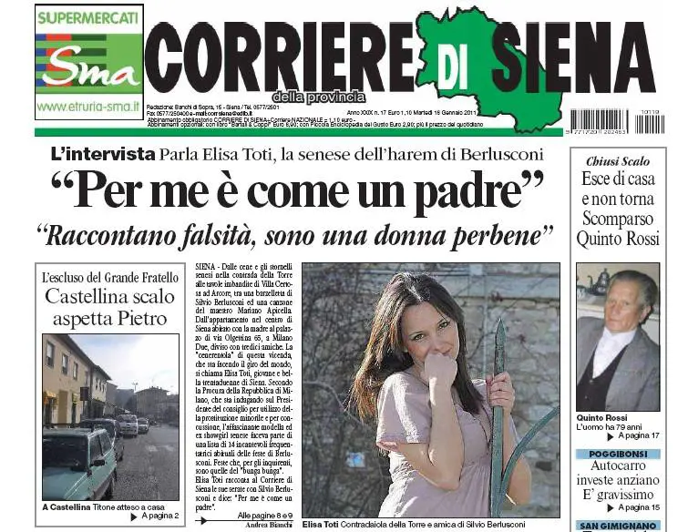 Milano - Non solo fango. Nei giorni dello sputtanamento morboso c'è anche chi abbassa i toni e racconta verità ben diverse. Niente bunga bunga, niente sesso, niente orge. Cene normali: si mangia, si canta e si balla. Lo racconta al Corriere di Siena Elisa Toti, trantaduenne toscana domiciliata Milano Due in via dell'Olgettina. Elisa è finita nel tritacarne della giustizia ad personam, la sua unica colpa è aver partecipato a una delle feste nella villa di Arcore. "I poliziotti sono entrati in casa mia alle sette del mattino, hanno sequestrato tutto, dai computer ai gioielli. Ci hanno trattenute per una giornata intera in questura, come delinquenti comuni". Inizia così l'incubo di una ragazza qualunque, uno dei danni collaterali della "guerra" contro il presidente del Consiglio.