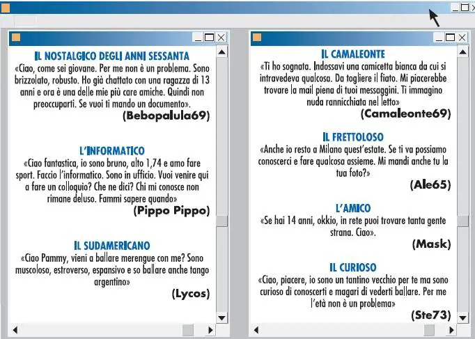 Quel «94» accanto al nome stuzzica la fantasia di molti. Api sul miele. Solo un paio di frequentatori della chat hanno vent’anni. Gli altri collezionano età da padri di famiglia. E in effetti lo sono. Hanno moglie e figli a casa. Ma dall'ufficio si sbizzarriscono in tenere mail a una quattordicenne sconosciuta. Hanno oltre trent’anni in più di lei e cercano di conquistarla con frasette facili e una complicità inesistente. Uno di loro ha 40 anni, un altro ne ha 45 suonati. Gli argomenti sono banali: anche parlare di musica, con più di trent’anni di differenza, non è poi così scontato. A lui piacciono i Pooh e ha l'intera collezione di dischi in vinile. Pammy invece ascolta i Tokio Hotel sull’I-Pod. Un abisso. Eppure, dopo pochi scambi di battute («Io studio al linguistico», «Io lavoro in un concessionario di auto»), nulla di più, i toni diventano subito confidenziali. Come se ci si fosse frequentati per settimane, come se la scintilla fosse realmente scoccata. «Ti ho sognata - scrive tale Camaleonte - Indossavi una camicetta bianca da cui si intravedeva qualcosa. Da togliere il fiato. Ti immagino bionda, come sei?». E via dicendo. «Coma mai non rispondi?», «Dove sei finita?», «Vorrei trovare la mail piena di tuoi messaggini domani». Viene il dubbio che dietro a quei nickname ci siano semplicemente persone molto sole, con qualche problema a socializzare con le donne della loro età. Poi però a ripensarci, suona strana tanta insistenza con una quasi-bambina che, sì certo, dice di avere già un tatuaggio, ma racconta anche di andare ancora in vacanza con mamma e papà e di non avere il permesso di uscire la sera se non per un gelato sotto casa.