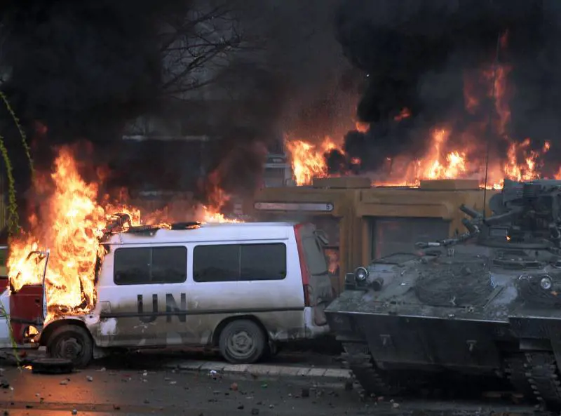 "Un’esplosione ha avuto luogo nel nord del Kosovo alle ore 8.10 e ha ferito tre poliziotti dell’Unmik e due soldati della Kfor", ha affermato la polizia in un comunicato. "Io presumo che si tratti d’una granata a mano gettata nel tribunale", ha indicato Besim Hoti, portavoce della polizia. Attorno al tribunale si sono radunate migliaia di serbi, che hanno preso a lanciare pietre e bottiglie molotov contro i militari e i poliziotti. Questi hanno risposto lanciando gas lacrimogeni e granate stordenti, puntando a disperdere la folla. Almeno un veicolo dell’Onu e uno della Nato sono stati incendiati. Nella città si sono uditi colpi d’arma da fuoco e i serbi hanno innalzato barricate fatte di auto e di cestoni dei rifiuti. Secondo Veton Elshani, portavoce della polizia dell’Onu a Pristina, sono stati fermati 53 serbi.