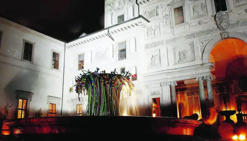 Suggestivo anche il lavoro realizzato site specific per la fontana di Villa Medici nel 2000 e oggi riproposto, una fontana nella fontana: tubi colorati che gettano acqua, a svolgere una funzione preesistente.