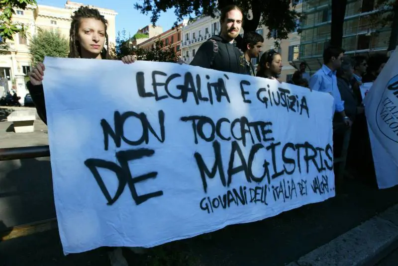 termini non comporti più l’urgenza del provvedimento di trasferimento, ma il magistrato svicola, pregando di farlo passare, di liberarlo dalla morsa dei giornalisti: «Non sono valutazioni che devo fare io», taglia corto. Il comitato di solidarietà che si è radunato nei giardinetti al centro della piazza è costituito soprattutto da studenti. Solo una trentina, ma cercano di fare più chiasso possibile. C’è Aldo Pecora, leader del movimento che ha raccolto negli ultimi giorni 90mila firme per impedire il trasferimento del pm calabrese, con la benedizione di Beppe Grillo. C’è l’autore del libro La società sparente, Emiliano Morrone. C’è Sonia Alfano, figlia del giornalista Beppe ucciso dalla mafia, che ha anche partecipato alla polemica trasmissione di Michele Santoro, Annozero. Ci sono alcuni giovani del gruppo dei «Ragazzi di Locri», che si batte contro la ’ndrangheta in Calabria. E, non poco eterogenei, ci sono 2 o 3 rappresentanti dell’Italia dei Valori, con la loro bandiera di partito. Il sit-in, più tardi, si sposta a piazza Esedra per continuare a manifestare e gridare in difesa di De Magistris. Al centro c’è sempre lo striscione: «E adesso trasferiteci tutti». Con il tutti scritto in rosso, come il sangue.