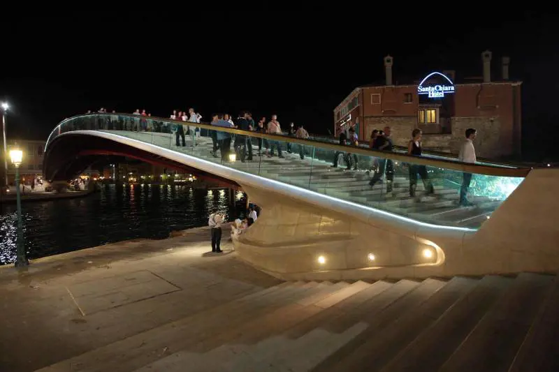 Venezia - Dopo essersi visto negare la gioia dell’inaugurazione ufficiale per paura delle contestazioni dei vari comitati, il presidente Napolitano, alla vista del ponte della Costituzione, opera del genio di Santiago Calatrava, non ha saputo trattenere l’emozione: «Che meraviglia». Per la gioia del sindaco Massimo Cacciari, che per quella meraviglia non ha esitato a «investire» circa 12 milioni di eurozzi. Ma, si sa, il sindaco filosofo, di fronte alla bellezza e all’arte non fa e non chiede sconti. E poi il 435° ponte di Venezia, cruciale perché collega piazzale Roma alla ferrovia, roba da 15mila passaggi al giorno, non poteva ammettere imperfezioni estetiche e funzionali. Peccato che un paio di settimane fa una turista milanese abbia inaugurato la serie di persone che, forse abbagliate da cotanta bellezza, sono finite lunghe distese passando su quei gradini di vetro così eterei da diventare invisibili, provocando ruzzoloni a volontà.