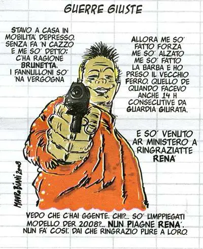 Saremo infatti anche un po’ ottusi, ma sinceramente guardando il disegno e leggendo il testo non abbiamo avuto l’impressione che il bersaglio della satira, come ha detto Staino, fosse la follia del soggetto con la pistola in pugno. No, l’impressione, a noi comuni o forse un po’ faziosi lettori, è che il bersaglio fosse Brunetta, e c’è da sperare che la stessa impressione non l’abbia avuta qualche esaltato sempre pronto a «farsi giustizia da sé», magari in nome del proletariato: anche perché il titolo della vignetta - altro particolare non irrilevante - era «guerre giuste».