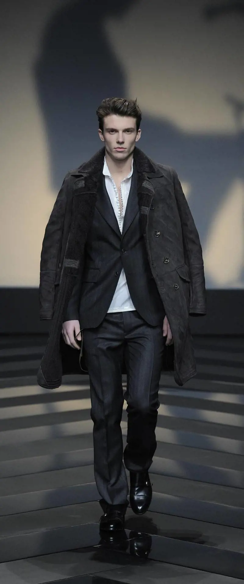 Dello stesso segno più che positivo la straordinaria collezione di Roberto Cavalli. A disegnarla da qualche stagione è il figlio Daniele che non la sa descrivere a parole per timidezza o forse paura, ma senza dubbio nella costruzione dei capi e dei decori ha la stessa energia creativa del suo vulcanico padre. Così mentre lui tenta di spiegare che la sua fonte d'ispirazione è una fiaba intitolata The charmer (l'incantatore) scritta da un amico d'infanzia (Alex Herbert Postiglione) in cui si parla di figure accarezzate dal vento e di animali come la tigre, il coccodrillo, gli uccelli e le piume, sgattaioliamo nel backstage ad ammirare i capi da vicino. Anche qui c'è una mantella con l'inconfondibile motivo tigre trasformato in texture nel cashmere nero e blu copiativo. Lo stesso supremo esercizio di stile si ritrova nel giubbotto in pelle nera matelassè oppure sulle impunture a rilievo del cappotto di velluto blu. Una variante ricamata con la tecnica «cornelly» dei burnus marocchini diventa qualcosa di squisitamente opulento, da divo del rock. Mentre innumerevoli piume d'uccello stampate su giacche, camicie, calzoni e sciarpe svolazzanti fanno davvero pensare al vento che tutto confonde tranne un'idea di mondo molto precisa. Quando in passerella compare lo smoking con la squama del pitone trasformata in ricamo sui reverse si capisce che l'uomo Cavalli ha subito un'evoluzione, non una rivoluzione perché sa rimanere sotto il segno dell'alto artigianato italiano. Certo questo eclettico signore non ha molto da spartire con la raggelante bellezza del killer di Wall Street immaginato dal bravissimo Raf Simons per Jil Sander. In pelle dal mattino alla sera, con le più scure fumature di ardesia, grigio e nero, questa divina creatura di sesso maschile sulle spalle ha una specie di marinaretta decorata da un disegno infantile e in mano tiene un sacchetto di cuoio identico a quelli che in carta ti dà il panettiere. Sono gli unici segni per così dire di umanità in un'immagine che ridisegna le categorie del classico stile da business man.