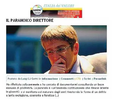 Milano - «Postato da Luigi Li Gotti in “informazione”». E meno male. Chissà se fosse stato postato in “insulti”. Sul sito dell’Italia dei Valori ci si dedica alle offese mascherate da diagnosi mediche. Così, giusto per dare del «paranoico» al direttore de «Il Giornale». Così, giusto perché ha osato levare qualche dubbio sulla purezza di Antonio Di Pietro. Democrazia, la chiamano. “Dei valori”, si definiscono.