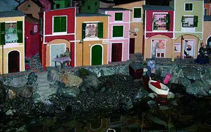 Non andateci se non avete almeno un'ora di tempo per apprezzare ogni particolarità di questo presepe dove tutto è sincronizzato al secondo. Tra l'alternarsi del giorno e della notte, dalle case alle antiche botteghe, nel lavoro nei campi, alle osterie è tutto un coordinarsi di movimenti che si alternano. Così durante il giorno si vedranno all'opera taglialegna e falegnami, donne intente ai lavori di casa, il verduraio che offre la propria merce bussando alla porta di una casa, nell'angolo dei pescatori c'è chi è intento a cucire le reti o il trippaio che nella sua bottega in marmo, taglia la trippa. La sera, cantano i «trallallero» con il bicchiere di vino in mano, mentre si accendono le luci delle osterie e quelle della case dove si intravedono scene di un tempo andato. Poi, quando a notte fonda cantano i grilli e tutto tace, l'unica luce che rimane accesa è quella del fornaio che sforna pagnotte e via fino al canto del gallo che rianima il presepe. Un ciclo che dura 8 minuti.