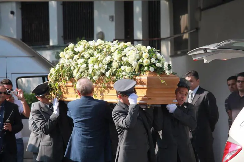 Milano - Addio a Sandra Mondaini. L'ultimo saluto ai funerali alla Chiesa di Dio Padre di Segrate (in provincia di Milano). A distanza di cinque mesi il dolore è lo stesso che aveva colto gli italiani per la morte di Raimondo Vianello. Sulla bara, che è stata salutata da un lungo e caloroso abbraccio a conclusione della cerimonia funebre, è stato posto un pupazzetto di Sbirulino, l’indimenticabile personaggio per i bambini interpretato dall’attrice.