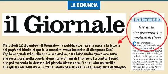 I fatti risalgono ad alcuni giorni fa: dopo un primo «no», qualche tempo dopo il ragazzino ha ripetuto alla docente la richiesta di disegnare Gesù Bambino e di appenderlo come decorazione natalizia. Di fronte al secondo «no», stavolta espresso con maggiore enfasi, il bimbo è tornato a casa turbato e ne ha parlato con i genitori.