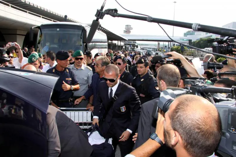 Roma - E' un mesto rientro quello degli azzurri questa mattina a Fiumicino. Dal 777 Alitalia sono sbarcati poco dopo le 8 il presidente federale Abete, il Ct Lippi ed alcuni giocatori: il capitano Cannavaro, Pepe, De Santis, Quagliarella, Bonucci, Montolivo, Gilardino e Di Natale. Tra gli ultimi a scendere le scalette dell'aereo De Rossi, l'unico dei quali sotto l'aereo ha ricevuto qualche incitamento da diversi operatori aeroportuali che si erano lì radunati. Tra la quarantina di persone sbarcate, compreso parte dello staff tecnico, anche Riva, Peruzzi e Di Livio. Lungo il tragitto dall'aereo alla sala arrivi tutti sono rimasti in silenzio, sulla navetta bus, alcuni con indosso occhiali da sole: sguardi tesi, gli unici a dispensare qualche sorriso De Rossi e Di Natale. Una volta giunti nella sala arrivi, si è radunata spontaneamente una piccola folla di viaggiatori in quel momento presenti che ha circondato, incuriosita, la delegazione azzurra, alla quale è stato fatto un piccolo cordone di agenti di polizia e militari della Guardia di Finanza. Molti hanno scattato foto ricordo ed i più gettonati di tutti sono De Rossi e Quagliarella. Anche capitan Cannavaro si è concesso a foto ricordo con alcuni dei viaggiatori in attesa anche essi dei bagagli.