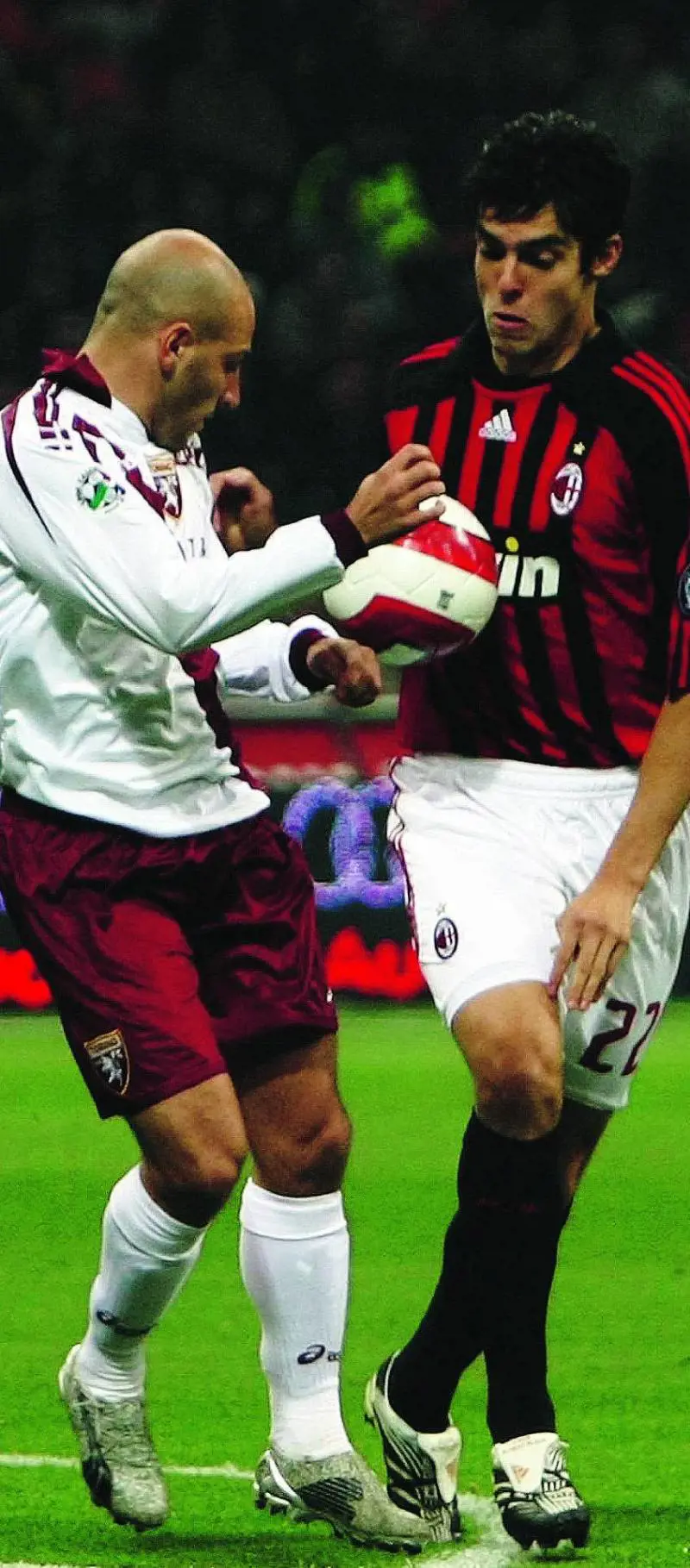 Se il Milan avesse avuto a sua disposizione nel recentissimo passato un centravanti normale, non Van Basten, sarebbe subito dietro l’Inter. E l’aggettivo normale sta anche per Ronaldo, non quello in formato extra-large ma il fuoriclasse del gol capace di trascinare, quasi da solo, nel primo semestre del 2007 i berlusconiani al quarto posto. Uno degli effetti visibili di questa lacuna è la prova di Kakà, il quale punta la porta e tira appena entra in possesso del pallone nei venti metri finali. Firma una, due, tre, cinque volte esecuzioni di ogni tipo, piazzando il destro o il sinistro riuscendo solo a sfiorare il bersaglio granata.