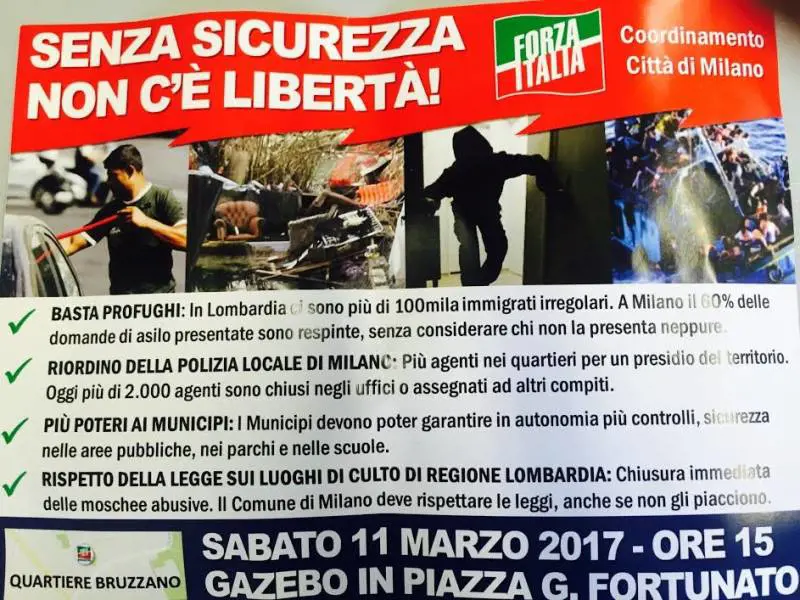 I volantini parlano chiaro. Si parte con l'appello «basta profughi» perchè «in Lombardia ci sono più di centomila immigrati irregolari e a Milano il sessanta per cento delle domande di asilo presentate sono respinte, senza considerare chi non le presenta neppure». Secondo step, le proposte. Come il «Riordino della polizia locale di Milano» che si traduce con «più agenti nei quartieri per un presidio del territorio. Oggi più di 2mila ghisa sono chiusi negli uffici o assegnati ad altri compiti».