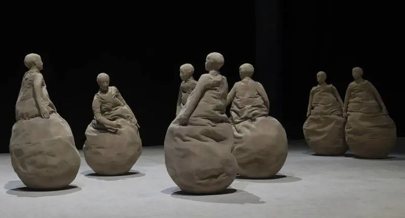 Muñoz cresciuto nella Madrid ancora franchista, espulso da scuola, scappato giovane in Inghilterra poi a New York è molto spagnolo nel gusto per il teatro e per la rappresentazione. Mai barocco, però: sceglie materiali semplici e pochi colori. Vicino all'Arte Povera (è stato assistente di Mario Merz) e amico di Richard Serra, è capace di creare una scultura tutta sua, ora attenta a ogni dettaglio della figurazione, nei volti e nelle vesti dei suoi omini, ora simbolica, come in «Conversation Piece», dove i personaggi diventano biglie antropomorfe. Buffi o inquietanti? Entrambi: Muñoz è artista che ha capito perfettamente il potenziale infinito della gestualità e dell'espressività di noi umani. La mostra è un crescendo che ha nell'imponente installazione «Double Bind & Around» il suo acme: ideata ed esposta per la prima volta alla Tate di Londra nel 2001 (era ancora in corso quando un infarto si portò via l'artista), è enorme e va vista su due livelli. Apparentemente sembra un parcheggio industriale a più piani, di fatto è una macchina scenica. La visione dall'alto, accessibile grazie a una scala, svela finte finestre disegnate sul tetto che, quando si scende al piano inferiore, non esistono più.