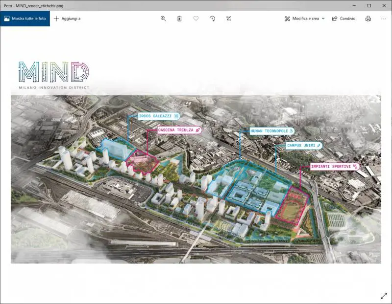 Il progetto dell'intera area Mind è più esteso e complesso, come racconta il Piano Integrato di Intervento presentato da Arexpo spa e approvato dalla giunta un mese fa: su una superficie di 1 milione 44mila metri quadrati è previsto l'insediamento del nuovo polo ospedaliero IRCCS Galeazzi, i cui lavori sono già in corso e del Campus dell'Università Statale. A garantire continuità tra i diversi interventi il Parco Tematico Scientifico Tecnologico di 650mila metri quadrati destinato a diventare luogo di incontro e interazione.