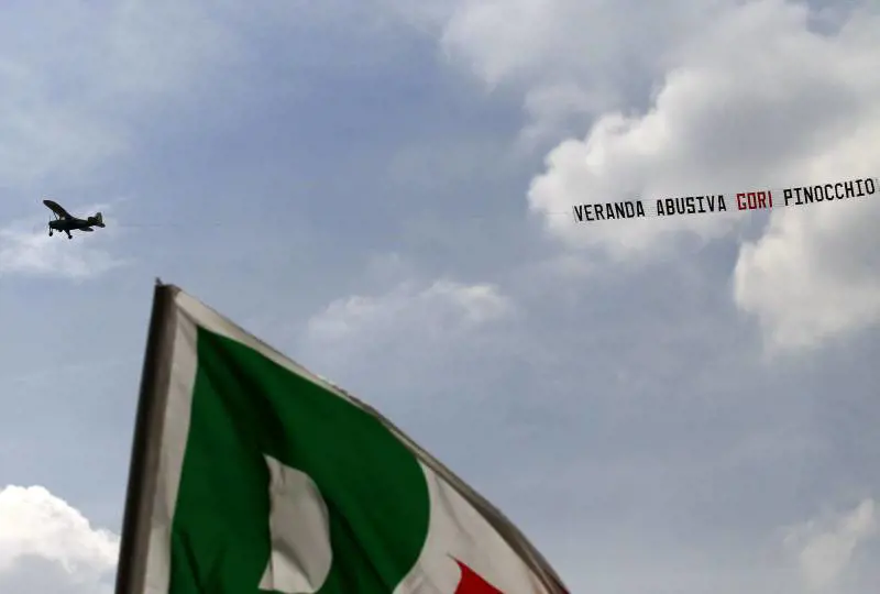 Vola alta sui cieli di Bergamo, con la scritta «Veranda abusiva. Gori Pinocchio» stampata su uno striscione trainato da un piccolo aereo, che è passato una, due