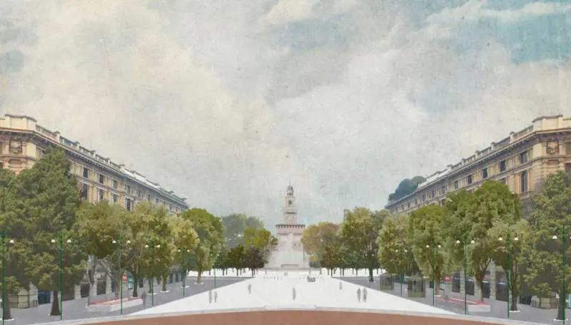 Un grande boulevard in calcestro bianco, che parte dal fondo di via Dante, attraversa largo Cairoli - senza più aiuole intorno al monumento a Giuseppe Garibaldi, come se fosse un'unica grande area semi-pedonale -, prosegue lungo via Beltrami, si estende su tutta l'area pedonale ai lati della fontana (sotterrando asfalto e vialetti) e si unisce idealmente allo sterrato che attraversa il Castello e ai vialetti del parco Sempione. Si ispira alla tradizione ottocentesca francese, al biancore della passeggiata in Place des Vosges o Champ de Mars a Parigi, il progetto che ha vinto il concorso internazionale di riqualificazione dell'ambito piazza Castello-Foro Bonaparte indetto lo scorso maggio dal Comune. Hanno partecipato in 151 (venti proposte dall'estero), 61 progetti sono arrivati alla seconda fase e ieri in seduta pubblica al Castello sono stati proclamati i primi dieci classificati (i disegni sono in mostra nella sala Viscontea fino al 21 febbraio). Sul podio il piano che ha come capogruppo l'architetto Emanuele Genuizzi. «Propone - si legge nella motivazione della commissione presieduta da Maurizio Carones e formata da tecnici del Comune, dell'Ordine degli Architetti e Ingegneri e anche da due rappresentanti dei comitati cittadini sulle barricate durante l'improvvisata pedonalizzazione dell'ex sindaco Pisapia - l'uso di molti elementi già presenti, ottiene un risultato coerente e ordinato, favorisce la fruibilità e dimostra una buona fattibilità economica». Il disegno firmato da Genuizzi prevede un ampliamento dell'area verde ai lati del Castello, la piantumazione di 134 nuovi alberi di specie autoctone (aceri montani e campestri, frassini, olmi, cerri) e la creazione di un doppio filare di aceri fino agli incroci con via Sella e via Ricasoli, «come una galleria verde, protetta da un doppio colonnato di alberi». In via Beltrami il grande parterre offre ampi spazi ai lati per i chioschi già esistenti e le stazioni del Bikemi, potrebbero essere installati ascensori per collegare la piazza al mezzanino della metropolitana e nuovi lampioni. Anche le «gallerie verdi» avrebbero un'illuminazione ad hoc, con luci a led. I chioschi di generi alimentari, prevede il progetto, «qualora provvisti di dehors dovranno essere attrezzati con elementi di arredo di colore e disegno uniforme (tavolini, sedie, ombrelloni)» e oltre ai chioschi presenti o nuovi che potranno essere inseriti nell'area pedonale in calcestre, viene proposta la creazione di «2 piccoli padiglioni come servizi igienici».