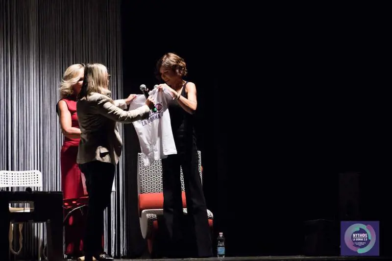 Artista, madre, manager. Si è raccontata alla platea di Mythos 2.0, una rassegna sulle donne al teatro San Babila. La sua vita a Los Angeles, la strada dell'artista seguita con abnegazione, essere madre con coraggio e forza. Per questo nella serata dedicata dalle aziende è stata premiata da Ilaria Amè, Vittorio Vaccaro e Elena Aceto Di Capriglia, proprietaria del marchio Miamo