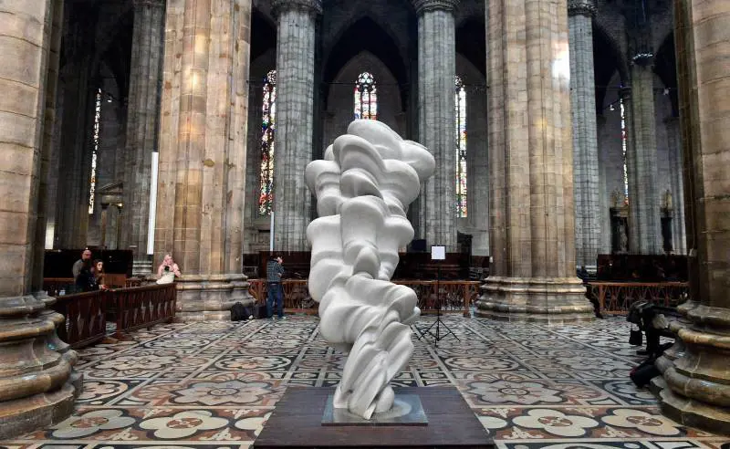 L'artista di Liverpool, che aveva scelto un'altro nome per la scultura, era presente in un messaggio video. Per lui ha parlato la sua opera, posizionata nella quarta campata sud della Cattedrale dietro una vetrata. «All'inizio doveva essere realizzata in marmo di Candoglia come il Duomo. Non si è potuto fare perché non esistono blocchi di Candoglia tanto grandi» spiega Angelo Caloia, presidente della Veneranda Fabbrica del Duomo che ha voluto onorare il cammino verso Expo con una nuova presenza artistica, diversa dalle forme tradizionali a cui l'arte cosiddetta sacra ci ha abituati. E' sacra o non sacra questa colonne d'onde che si sovrappongono come in una marea che sale in verticale? Sono stati in molti a chiederselo, ma forse sarebbe più giusto domandarsi cosa sia sacro oggi.