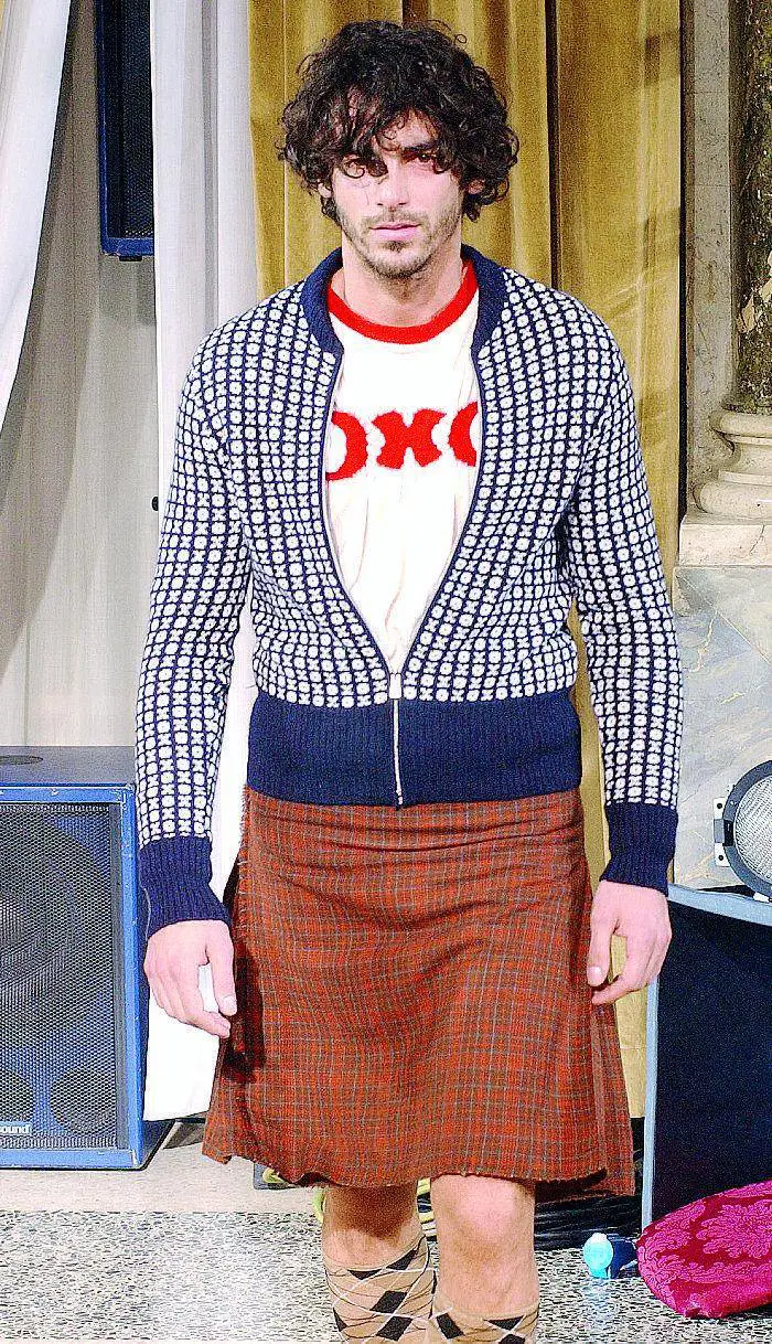 E' il sogno della gonna colleggiale indossata ai tempi dei piccoli grandi amori innevati da pudiche «Love Story»: chic, nei suoi quadri grigi, neri, di superba rifinitura nelle pieghe, british nelle stringhe in pelle e nelle fibie importanti. Peccato che sia da uomo, e peccato che lo siano la camicia bianca con colletto rotondo profilato di blu di Vivienne Westwood e una camicia di Etro azzurra con mini disegni cashmere lilla e prugna.