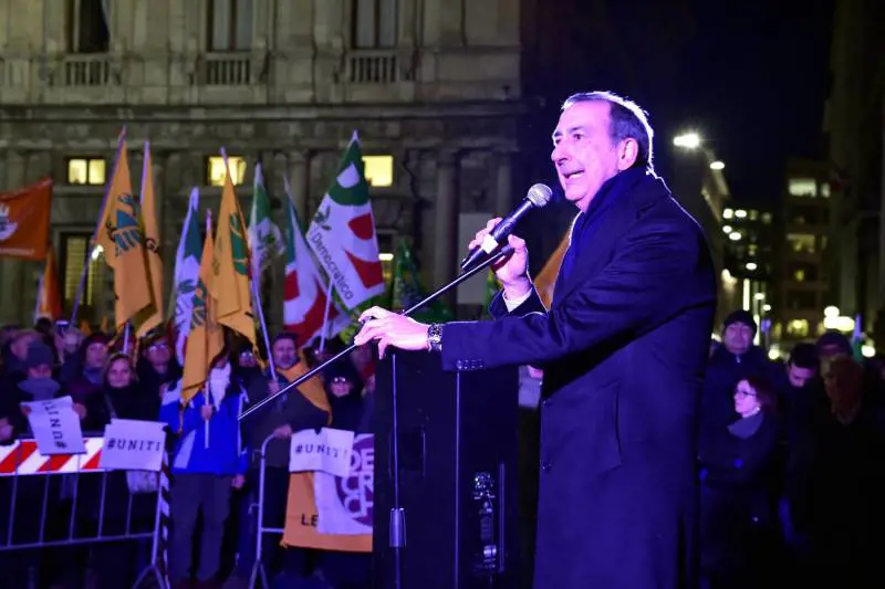 In piazza la manifestazione "uniti" è stata indetta dal Pd e vi hanno partecipato 50 associazioni, tra cui Arci, Acli, Legambiente, Anpi, Psi, Verdi e SinistraXMilano.