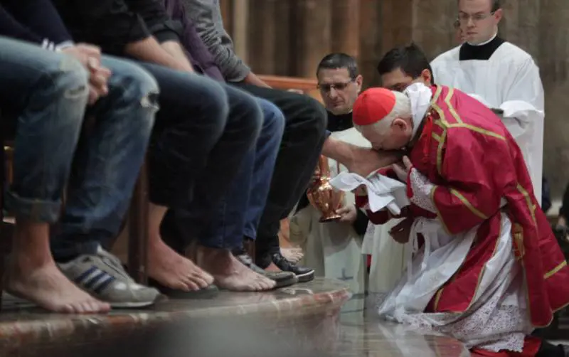 L'arcivescovo Angelo Scola ha presieduto nel Duomo la Messa in «Coena Domini» preceduta dal rito della lavanda dei piedi. Scola ha lavato i piedi a dodici catecumeni (cinque cinesi, cinque italiani, un giapponese e un albanese) che nella notte di Pasqua riceveranno il battesimo, gesto che esprime l'obbedienza al mandato di Gesù di servire i fratelli. Nell'omelia il cardinale ha detto, tra l'altro che «ricreare il tessuto sociale a partire dai legami costitutivi con Dio, con gli altri e con se stessi è la strada necessaria per l'edificazione del nuovo umanesimo di cui l'uomo del terzo millennio ha bisogno». «Il gesto della lavanda dei piedi oggi compiuto in pallida memoria di quello di Gesù - l'auspicio - sia per noi sorgente di appassionato servizio ecclesiale e civile».