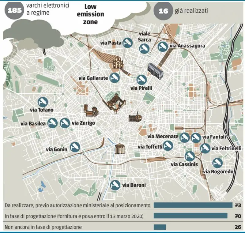 Le prime telecamere antismog cominceranno a «scattare» multe a partire dal 21 febbraio, anche se il sindaco Sala ha già annunciato una sorta di moratoria per i primi tre mesi: agli automobilisti arriverà una lettera di avvertimento. La Lez (low emission zone) sarà una vasta area vietata alle auto a benzina Euro 0, ai diesel Euro 0, 1, 2 e 3 (da ottobre 2019 anche agli Euro 4) con 185 varchi elettronici lungo il confine che non lasceranno scampo ai furbetti. Calma e gesso. Ad oggi, come si legge nella delibera approvata dalla giunta a fine giugno, solo sedici varchi sono già stati realizzati in toto. E dal momento che il sindaco aveva anticipato che Lez partirà gradualmente dal 21 gennaio con una dozzina di telecamere accese per estendere via via il sistema nel corso dell'anno, si può almeno intuire quali strade diventeranno da bollino rosso per i milanesi: i varchi che rientrano nella «fase 1/a) sono in via Anassagora, viale Pirelli, Sarca, via Pasta, Gallarate, Tofano, Basilea, Zurigo, Gonin, Costantino Baroni, Cassinis, Toffetti, Rogoredo, Feltrinelli, Mecenate, Fantoli. Altri 73 varchi (da via Corelli a via Padova, Senigallia, Vincenzo da Seregno, Lorenteggio, Chiesa Rossa, Ungheria, Forlanini) rientrano invece nella «fase 1B», sono finanziati con risorse del Ministero delle Infrastrutture e pronti per essere realizzati «previo rilascio della preventiva autorizzazione ministeriale al posizionamento». Con la delibera approvata a fine giugno la giunta ha invece affidato ad Amat solo ora la progettazione, direzione dei lavori e successivo collaudo tecnico di altri settanta varchi (i lavori saranno affidati con gara pubblica). Il valore dell'opera si aggira intorno a 2,7 milioni di euro e Amat riceverà un compenso pari a 381mila euro. Da cronoprogramma la fase di gara è prevista tra febbraio e settembre 2019 quindi la fornitura e la posa delle telecamere non finirà prima di marzo 2020. I varchi che rientrano nella «fase 1C» andranno posizionati da via Rizzoli a via Boffalora, viale Famagosta, Achille Papa, via Gattamelata, viale Certosa. Per completare la «maxi cerchia antismog» mancano ancora all'appello 26 varchi elettronici della «fase 1D» catalogati come «oggetto di un successivo progetto», possono restare tranquilli fino all'ultimo gli automobilisti abituati a passare in via Silla, Muggiano, Pindaro, Turbigo.