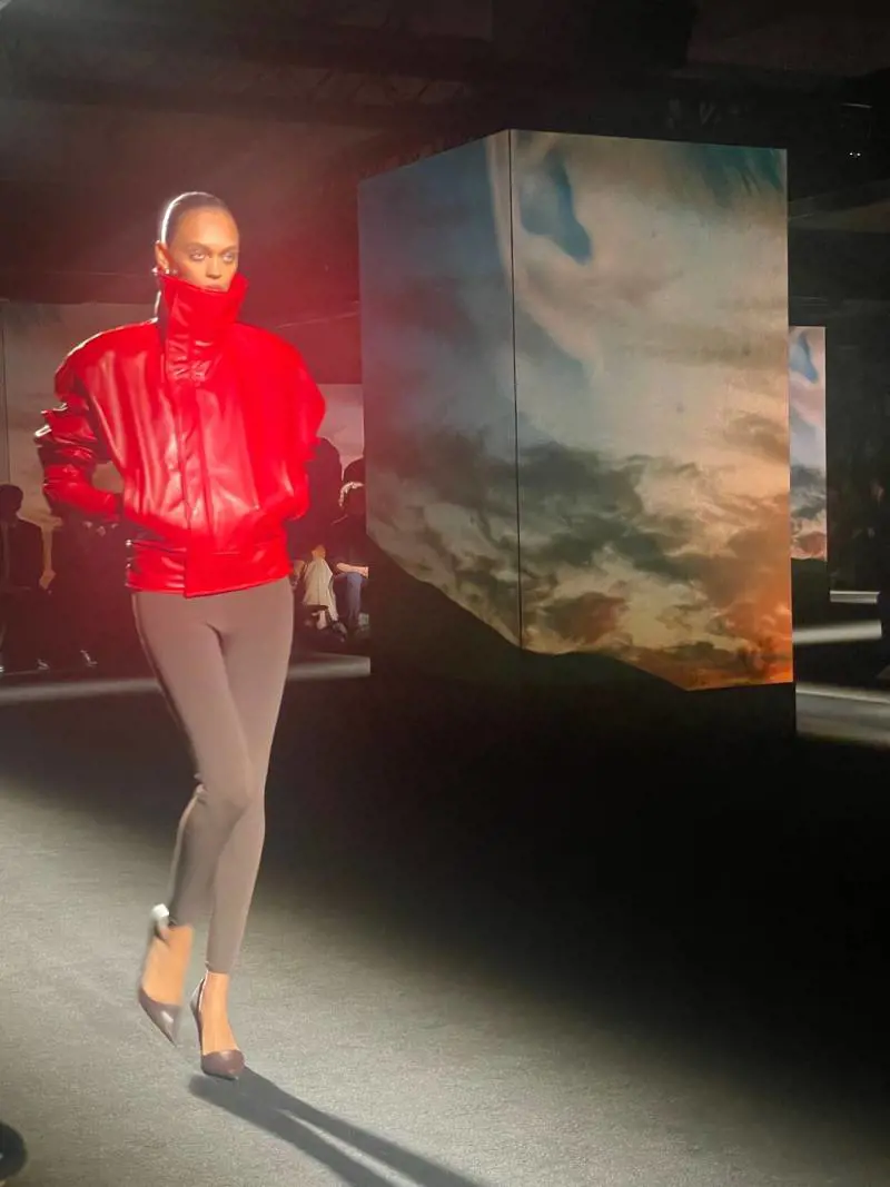 Serpreggia un po' ovunque l'idea di lasciar passare l'aria tra abiti, accessori e corpo per cui giacche, giacconi e paltò hanno spesso il collo a cratere che, una volta aperto diventa una specie di mantellina. Invece le scarpe che sono spesso delle eleganti pantofoline tecnicamente chiamate “mules” in punta sembrano scostate dalle dita dei piedi. I tacchi sono alti, non altissimi e alcune borse sembrano ammaccate pur avendo una costruzione interna così perfetta che si possono portare sia con un solo manico, sia con due. Le prime uscite prevedono soprattutto giacche, cappotti, pantaloni larghi per lui, qualche fuseaux oppure splendidi jeans a vita alta per lei. Poi arrivano i modelli in jersey tagliati come pepli e meravigliosamente drappeggiati sul corpo lasciando qualche lampo di nudità. Il tutto nei colori più sobri e indovinati che si possano immaginare: tanto nero,grigio, bordeaux, cioccolata e, ogni tanto, dei lampi ciliegia. Lo show si svolge in una specie di spazio industriale abbandonato sotto un elegante edificio al 22 di Champs Elysee. La regia è affidata a Sam Levinson, Deus Ex Machina di Euphoria, la serie televisiva americana ormai giunta alla terza stagione.