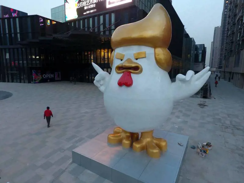 finale è molto più imponente di quanto aveva immaginato. Nessuna spiegazione sul perché quel gallo assomigli al nuovo presidente americano: la Beijing Reliance Commercial Land voleva solo una statua per l'anno del Gallo.