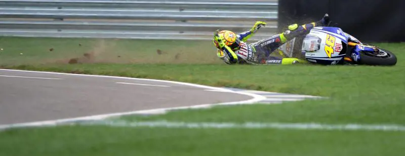 Indianapolis - Tutti giù per terra. Prima Dani Pedrosa. Poi, quello che più conta, Valentino Rossi. E' il decimo giro quando il leader della corsa, che era finito nel prato quando non era ancora scoccata la quinta tornata, e quello del Mondiale lasciano via libera a Jorge Lorenzo per 18 noiosissimi (per il pubblico), ma felicissimi (per lui) giri. Lo spagnolo, che ha appena rifirmato per la Yamaha, non deve neanche sudare troppo per riaprire un campionato che dopo la sua caduta di Brno sembrava già ipotecato dal Dottore. Valentino si esibisce in una caduta in entrata di curva, con la moto, lanciata troppo velocemente per recuperare dalla piega precedente, che reagisce bruscamente alla frenata dell'otto volte campione del mondo disarcionandolo di sella. Rossi risale e tenta di proseguire, ma la manopola del gas è danneggiata irrimediabilmente e dice picche al pesarese. Il ritiro arriva al tredicesimo giro con il rientro ai box. Cavalcata facile per Lorenzo con alle spalle, staccatissimi, Alex De Angelis e Nicky Hayden. Con Andrea Dovizioso che chiude al quarto posto. C'è un minimo di gloria anche per Pedrosa che, in rimonta, ripartito ultimo, chiude al decimo posto.