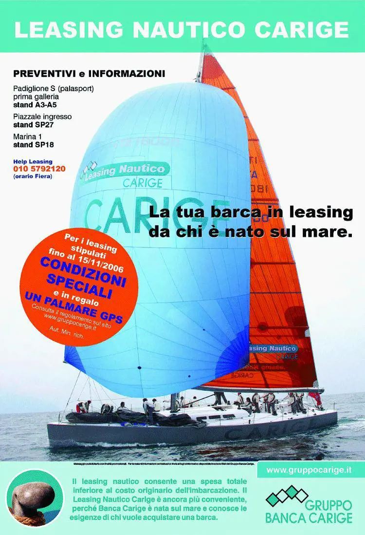 «Il Gruppo Carige si presenta con l'usuale ampia gamma di prodotti bancari, anche se è il Leasing Nautico Carige quello finalizzato a soddisfare le esigenze specifiche di finanziamento degli acquirenti di imbarcazioni nuove o usate. Si tratta di un prodotto molto competitivo che favorisce la compravendita di unità da diporto per i privati e anche per le imprese, unendo ai benefici del pagamento differito, l'agevolazione di una riduzione dell'incidenza dell'Iva variabile in relazione alle caratteristiche dell'imbarcazione acquistata (dimensioni e tipologia). In sintesi l'acquirente paga un prezzo globale più contenuto e dilazionato. Il Leasing Nautico Carige consente altresì di finanziare l'acquisto di imbarcazioni in costruzione, dando ai cantieri l'opportunità di incrementare i volumi d'affari, potendo beneficiare dell'anticipo dei loro crediti, ed è inoltre possibile, con la medesima formula, acquistare anche il posto barca».