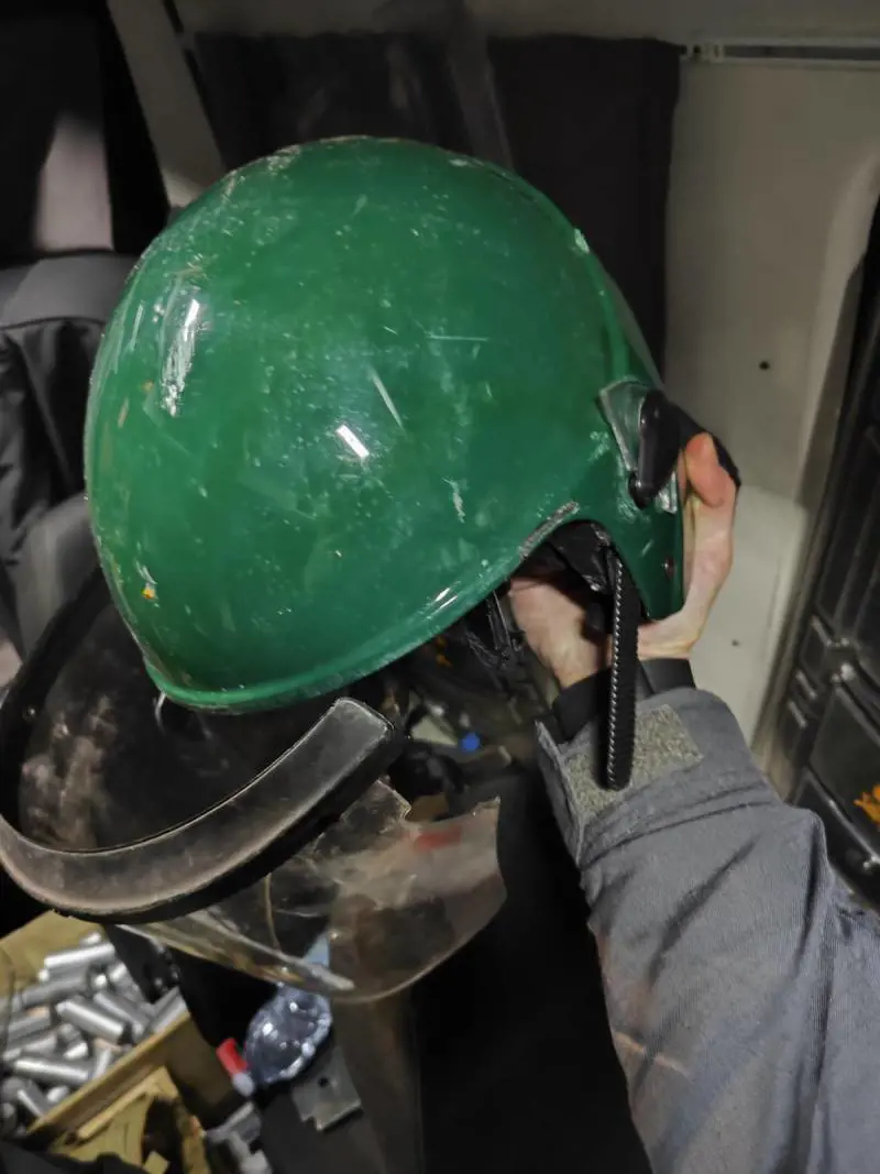 L'immagine, scattata nel retro di un mezzo blindato, mostra anche il contesto caotico: sul fondo si intravedono quelli che sembrano bossoli di artifizi lacrimogeni esausti. È la scenografia di una battaglia urbana dove, troppo spesso, le forze dell'ordine si trovano a fare da cuscinetto tra tensioni sociali esplosive.