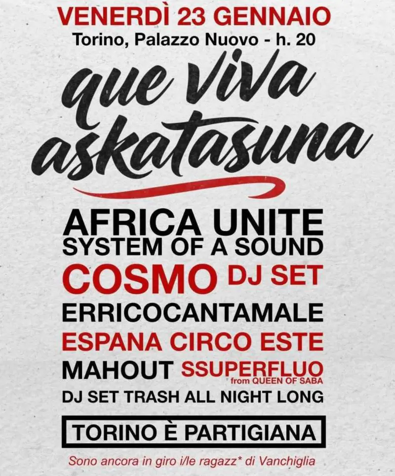 Prima del diniego della “magnifica”, Forza Italia ieri aveva già messo le mani avanti con un comunicato dei responsabili cittadini Marco Fontana e Roberto Rosso: «Abbiamo appreso che il prossimo venerdì 23 gennaio, gli antagonisti si starebbero dando appuntamento per un concerto a Palazzo Nuovo dal titolo “Queviva Askatasuna”. Confidiamo che l’Ateneo non abbia assegnato locali per questa attività, che risulta incompatibile non solo dal punto di vista della mission di un’istituzione accademica, ma che, dopo le minacce pronunciate durante l’incontro di sabato scorso ospitato al Campus Einaudi, risulterebbe anche avallare la mission di un gruppo eversivo.