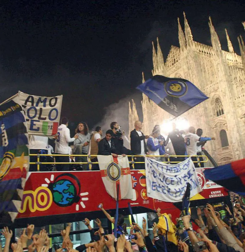 Ci sono tutti, persino i cani vestiti con le magliette dell’Inter e la piazza trema sotto i piedi dei tifosi che saltano intonando i cori della vittoria. Aspettano di poter vedere dal vivo i loro eroi, quelli che ai loro occhi hanno compiuto un’impresa, «alla faccia di tutte le cattiverie che sono state dette contro la squadra, dei gufi e degli invidiosi». L’Atm devia alcune linee del tram in città, mentre a Malpensa una folla di tifosi aspetta l’arrivo dei campioni. Ma i giocatori arrivano quando ormai è tardi, salutano il pubblico e una volta in piazza del Duomo salgono sulla terrazza che l’assessorato allo sport ha messo a disposizione e poi si ritirano in albergo. L’aveva fatto capire anche Mourinho a fine partita che i festeggiamenti sarebbero stati brevi, era bastato un gesto delle dita a richiamare velocemente la squadra, come se non ci fosse tempo da perdere. E così è, lo sanno anche i tifosi. «Si devono riposare»,- dice un ragazzo con la bandiera al collo..