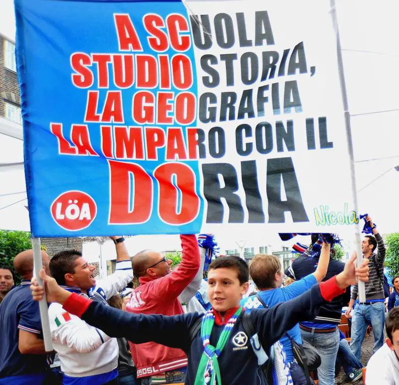 «Nicola questanno ha sottoscritto il 5° abbonamento alla stagione della Samp... basti pensare che la prima volta che è andato a Marassi aveva 3 anni», racconta papà Angelo, orgoglioso del proprio record personale dei trentanni. E gli brillano gli occhi quando parla dei suoi due bambini che condividono con lui una passione di famiglia che ha le sue radici nel 1946, quando il papà di Angelo, da Loano era venuto a studiare in collegio a Genova. Il nonno, allora ragazzo, per ribattere allo sfottò dei compagni tutti genoani che lo consideravano uno di fuori, cominciò a tifare per la nuova formazione. Oggi la sua discendenza viaggia su Internet: Nicola ed Elisa creano i disegni delle bandiere sul computer e poi li inviano a una stamperia di Venezia che in 24 ore rimanda la creazione pronta su tela.