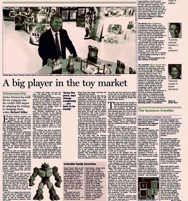 Momenti di gloria per il presidente del Genoa Enrico Preziosi, gloria che non gli viene dalla sua passione calcistica, bensì dal suo ruolo di imprenditore di giocattoli. Il Financial Times, il principale giornale economico-finanziario del Regno Unito ed uno dei più antichi, autorevoli e letti del mondo, dedica infatti un articolo al fondatore della Giochi Preziosi, lazienda di giocattoli che limprenditore «ha portato ad essere il quinto gruppo mondiale adattando la sua strategia ai tempi che cambiano».