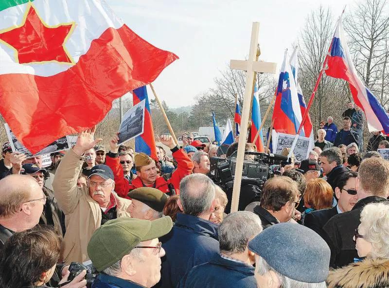 Arrivati a Lokev la settantina di esuli ha dovuto proseguire a piedi a causa di un divieto di transito posto, guarda caso, da poco. La comitiva si incamminaverso la foiba precedutada una croce di legno in segno di pietà per tutte le vittime della Seconda guerra mondiale. «Eravamo in silenzio, ma avvicinandoci abbiamo cominciato a sentire canti partigiani e slogan che non promettevano nulla di buono. Lungo la strada si intravedevano le prime bandiere slovene e jugoslave con tanto di stella rossa», racconta Lacota. A un certo punto gli esuli si trovano difronte a uno sbarramento umano di facinorosi. Come dimostrano le fotografie scattate dall’Unione degli istriani c’è chi porta orgoglioso la bustina dei partigiani di Tito o sventola un tricolore con la stella rossa in mezzo. Alcuni bambini, in stile Hamas, indossano uniformi mimetiche con simboli jugoslavi. E innalzano cartelli con le foto dei partigiani uccisi durante la Seconda guerra mondiale.