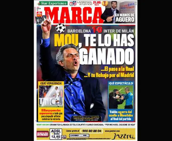 L'esultanza di Mourinho "È arrivato tardi" è invece il titolo del Mundo Deportivo sul gol di Gerard Piquè che "non è bastato ad un Barça che si è schiantato contro il muro italiano". "Addio al Bernabeu" è invece il titolo amaro del catalano La Vanguardia, che mette in prima la foto del portiere blaugrana Valdes mentre assale Mourinho che festeggiava la vittoria sotto la gradinata dei catalani a fine partita.