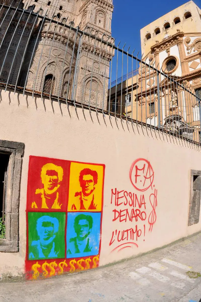 Palermo - Un grande murales che raffigura il volto del boss mafioso latitante Matteo Messina Denaro è stato disegnato alle spalle della Cattedrale di Palermo, su un muro che delimita piazza Settangeli dalla chiesa. È un’immagine a colori che sembra imitare lo stile della pop art di Andy Warhol, in particolare il volto di Marilyn Monroe. Il murales è composto da quattro ritratti, tutti dai colori diversi, che ricalcano una vecchia foto del latitante trapanese, che adesso è al vertice di Cosa nostra in Sicilia. Sembra una riproduzione in serigrafia del volto del capomafia. Alla base del disegno sono riportati otto simboli ($) del dollaro statunitense. Accanto, con vernice rossa, è stato scritto: «Messina Denaro $ L’ultimo!». Sulla destra, in alto, è stata lasciata una sigla «F.A.» che potrebbero essere le iniziali dell’autore del disegno.