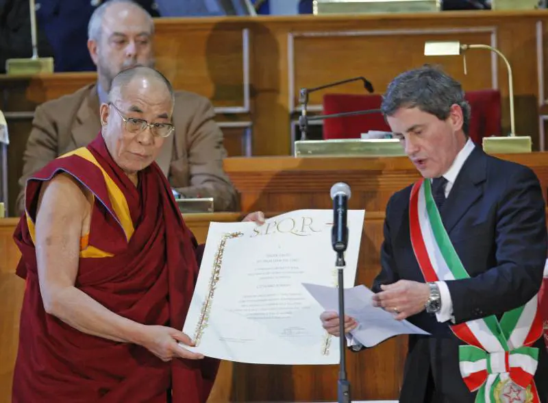 Cittadino onorario anche di Venezia È stato il sindaco di Venezia, Massimo Cacciari ad insignire della cittadinanza onoraria il Dalai Lama. Ricevendo la cittadinanza la massima autorità spirituale tibetana ha commentato il fenomeno dell’acqua alta: "Sono un po' preoccupato perché immagino che tra poco la città sarà allagata e io non so nuotare" ha detto tra i sorrisi dei presenti. "Questi riconoscimenti - ha aggiunto il Dalai Lama- non mi fanno sembrare né più alto né più basso ma riconoscono il mio comportamento ed il mio impegno".
