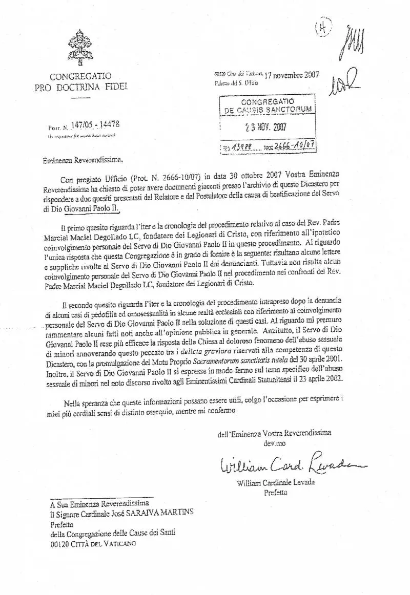 Roma - «Non risulta alcun coinvolgimento personale del Servo di Dio Giovanni Paolo II nel procedimento nei confronti del Rev. Padre Marcial Maciel Degollado LC, fondatore dei Legionari di Cristo». Le lettera riservata (protocollo n. 147/05 - 14478) porta la data del 17 novembre 2007 ed è firmata dal cardinale statunitense William Levada, Prefetto della Congregazione per la dottrina della fede, il successore di Ratzinger alla guida dell’ex Sant’Uffizio. Un foglio che rappresenta a tutt’oggi l’unico documento nel processo di beatificazione di Papa Wojtyla riguardante l’esplosivo e spinosissimo caso degli abusi perpetrati dal fondatore dei Legionari di Cristo e più in generale gli scandali della pedofilia.