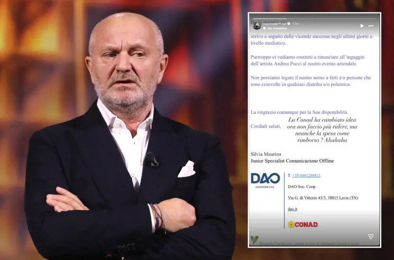 Con una Storia sul proprio profilo Instagram nel pomeriggio di lunedì 9 febbraio, Pucci fa lo screenshot di una mail inviata da parte dell’area comunicazione di Conad, società cooperativa della grande distribuzione organizzata. “Buon pomeriggio, a seguito delle vicende successe negli ultimi giorni a livello mediatico, purtroppo ci vediamo costretti a rinunciare all’ingaggio dell’artista Andrea Pucci al nostro evento aziendale”.