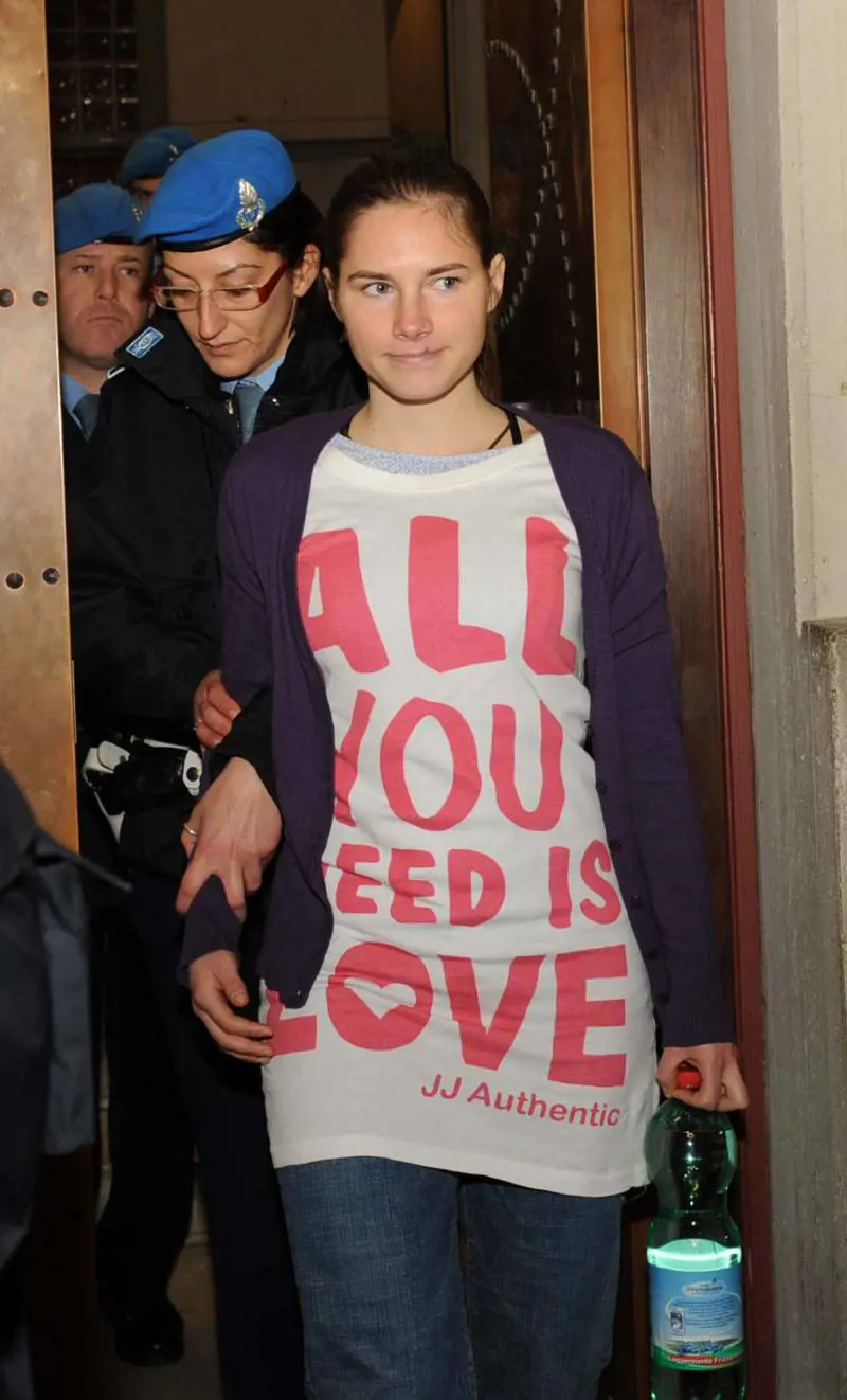 Maglietta bianca con la scritta "All you need is love" in grandi caratteri rossi sotto a un giacchetto viola, questa la mise Amanda Knox alla ripresa del processo davanti alla Corte d’assise di Perugia per l’omicidio di Meredith Kercher