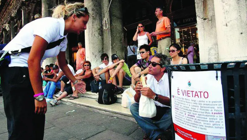 Intanto Gioia e le sei sue colleghe, assunte a mille euro al mese dall’azienda municipale Veste, proseguono a loro rischio e pericolo l’operazione moral suasion. Vale a dire, spiegare ai turisti ciò che neppure al Comando dei vigili urbani di Venezia hanno ben capito. In realtà un «decreto anti-panino» esiste, ma è scritto in maniera talmente burocratese da renderlo quasi incomprensibile. Tanto che migliaia di persone, ogni giorno, trasgrediscono proprio a pochi centimetri dal cartello che minaccia multe da «25 a 500 euro». Ecco il testo, diventato ormai una barzelletta: «In piazza San Marco, lungo i portici e le gradinate delle Procuratorie Nuove e nella loro prosecuzione per l’Area napoleonica e Libreria Sansoviniana, nella piazzetta dei Leoncini, lungo il porticato di Palazzo Ducale e San Marco e sul Molo è vietato sedersi e sostare per consumare cibi e bevande a esclusione delle aree in concessione ai Pubblici esercizi».