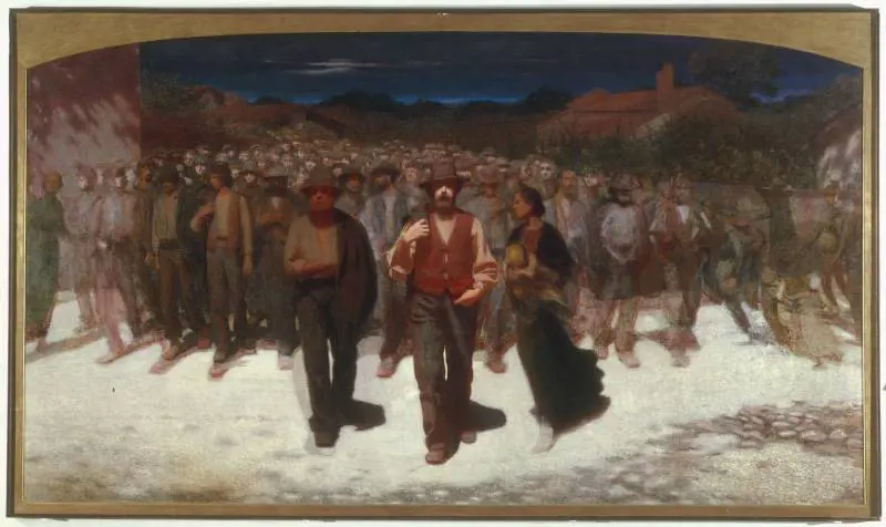 Protagonisti alla National Gallery sono Segantini con i paesaggi montani e con opere che si richiamano ai Preraffaelliti, a Burne-Jones, e Previati con un simbolismo che si riallaccia a Watts e Wagner, accanto agli stridenti messaggi sociali di Angelo Morbelli. Ma anche Nomellini, Balla con la travolgente Pazza dal suo Polittico, Boccioni, Carrà, Russolo. E Pellizza da Volpedo, con La processione, del 1892-95, e Fiumana che a Londra i critici considerano fra i più grandi dipinti dell’epoca. Incompiuto, il dipinto preparatorio del più famoso Quarto Stato brilla più per l’assenza che per la presenza della disciplina divisionista, quasi un’opera della scuola realista, abbozzata negli anni in cui l’artista osservava che «un divisionismo troppo evidente danneggiava le opere d’arte».