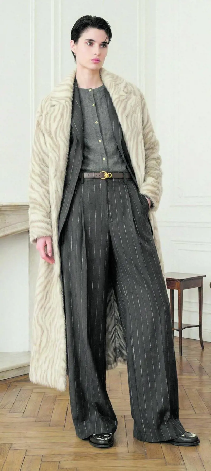 Bellissimo anche il completo verde militare in cotone trattato fino a sembrare un materiale geneticamente modificato tra pelle di daino e velluto. L'evoluzione della specie del classico Barbour fa da contraltare ai completi sartoriali in bouclè tra cui, a sorpresa, compare un colore che d'inverno non c'è mai: il giallo.