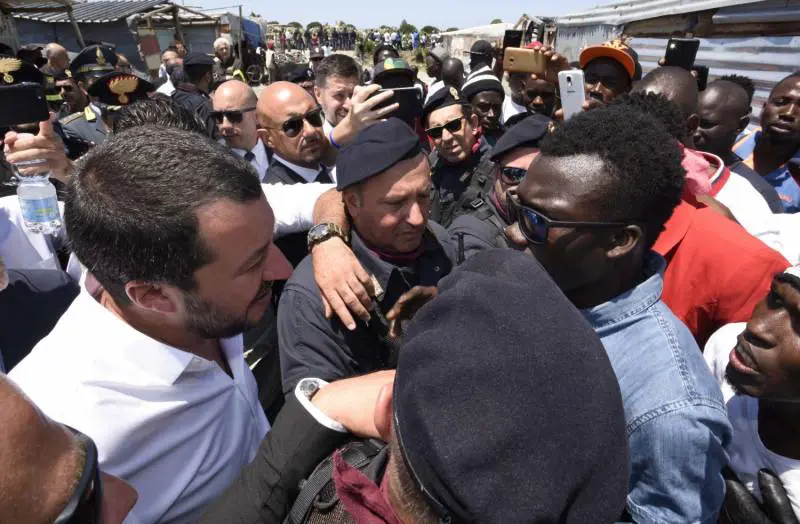 A San Ferdinando Matteo Salvini parla coi migranti: «Non è possibile vivere così. Capisco che vogliano la casa, il lavoro, che vogliano star bene, ma non c'è tutto per tutti». La visita in Calabria del ministro dell'Interno ha fatto tappa proprio nella tendopoli che ospita da anni immigrati senza acqua, luce, gas, senza i servizi basilari, in condizioni non igieniche e di totale precariato. «Prendiamo un euro a cassetta di frutta che raccogliamo - gli racconta un senegalese che, nel frattempo, lo filma con il telefonino di ultima generazione in mano. Anche tra noi ci sono i caporali neri». L'altra faccia di una medaglia già abbastanza corrosa da anni di illegalità.«Denunciateli» ribadisce Salvini. Ma c'è chi si lamenta. Allora un messaggio ai buonisti, a chi da anni consente che esistano in Italia dei luoghi come San Ferdinando o Rosarno: «È questo che dico quando parlo del fatto che non si può vivere così». Una situazione di disagio su cui, il ministro lo ha promesso, si dovrà intervenire, anche perché esiste un altro problema: quello delle forze dell'ordine che non riescono più a lavorare così, in condizioni di disagio in luoghi dove il rischio è la quotidianità e dove anche una scintilla può far scoppiare risse: Come quello che proprio in quella tendopoli ha portato all'omicidio di Soumayla Sako. Un problema che andrà affrontato a muso duro, che andrà preso di petto e per la cui risoluzione il titolare del Viminale ora cerca anche l'appoggio delle amministrazioni locali. Nella mattinata la visita era cominciata a Palmi, dove il ministro aveva fatto tappa visitando l'immobile confiscato alla cosca Gallico. «É cominciata una guerra senza quartiere - ha detto - contro la criminalità organizzata non solo in Calabria, ma in tutta Italia, perché la 'ndrangheta è una merda, un cancro, che si è allargato a tutta l'Italia. Io però sono testone e continuerò a combatterla fino a che non avremo portato via anche le mutande a questa gente». Sarà proprio quell'edificio che ospiterà il commissariato di Polizia di Palmi.