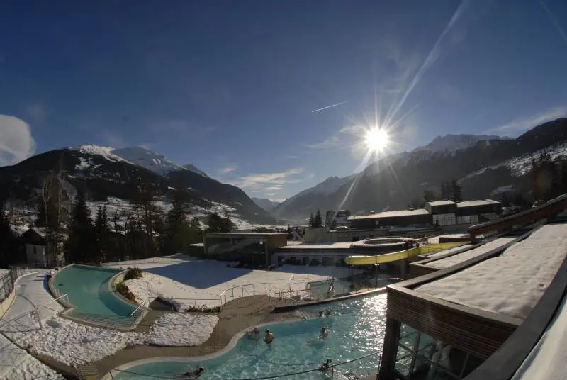 Gli ospiti vi trascorrono lunghe ore per ammortizzare il biglietto di ingresso non proprio economico e le lunghe file alla reception per strappare un accappatoio numerato che poi cambierà più volte di proprietario da un appendino all'altro, perché il numero non lo guarda nessuno, e poi si trascinano in passi di valzer in ciabatte tra le saune, le vasche, il percorso Kneipp che alterna caldo e freddo e sferza membra impigrite da piumini, piumoni e piume da cipri. E su tutti la bellissima vasca panoramica all'aperto che dà il ruspante brivido di farsi due passi seminudi a gradi meno sette sentendosi Amundsen in braghette.