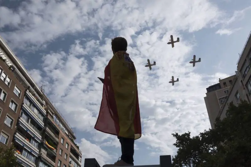 Come separati in casa tra Madrid e Barcellona ora è una guerra che si combatte a suon di nervi. E tutto va bene per servire la causa. Ieri era festa nazionale, la scoperta dell'America, e mai come ieri l'orgoglio spagnolo è stato celebrato, registrando una partecipazione popolare «storica», con migliaia di persone che hanno riempito i quasi due chilometri di percorso del Paseo de la Castelllana di Madrid. Sfilate, parate a santificare lo slogan della parata «orgogliosi di essere spagnoli». A Madrid come nelle altre città della Spagna, 800mila euro di costi, 420mila solo per le parate. A sfilare nella capitale 78 aerei militari, tremila e novecento militari, tra militari dei tre eserciti, agenti della Guardia Civil, polizia e uomini della Guardia Real unità a cavallo, veterani, mezzi di terra. E poi la partecipazione per la prima volta della polizia nazionale, messa a dura prova dalle tensioni in Catalogna. Una parata anche con incidente: un aereo da caccia che partecipava è precipitato al suo ritorno alla base nel sudest del Paese uccidendo il pilota. Ed a Barcellona è finita a sediate durante la manifestazione.