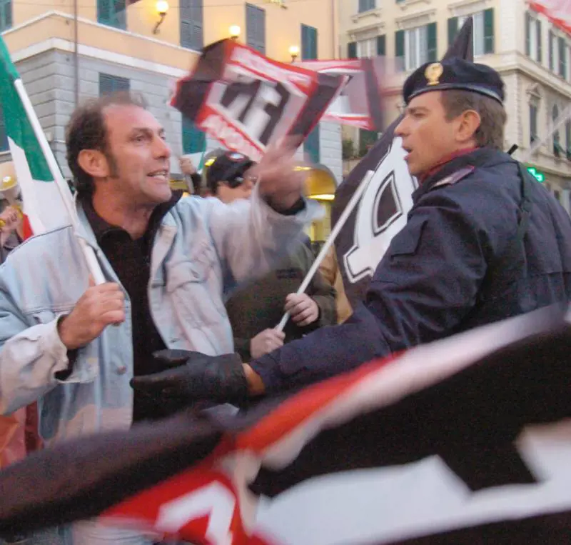 Ore 18,25. Il corteo arriva sotto la prefettura. In cima via Roma Riccobaldi, Fiore, don Giulio, arringano la piccola folla.«Genova non deve diventare come Marsiglia, le vostre auto intatte non come quelle bruciate dei parigini». Poi contro la politica a favore dell'immigrazione di Prodi, delle agevolazioni gratuite e dei soldi spesi per nomadi e immigrati a Genova.